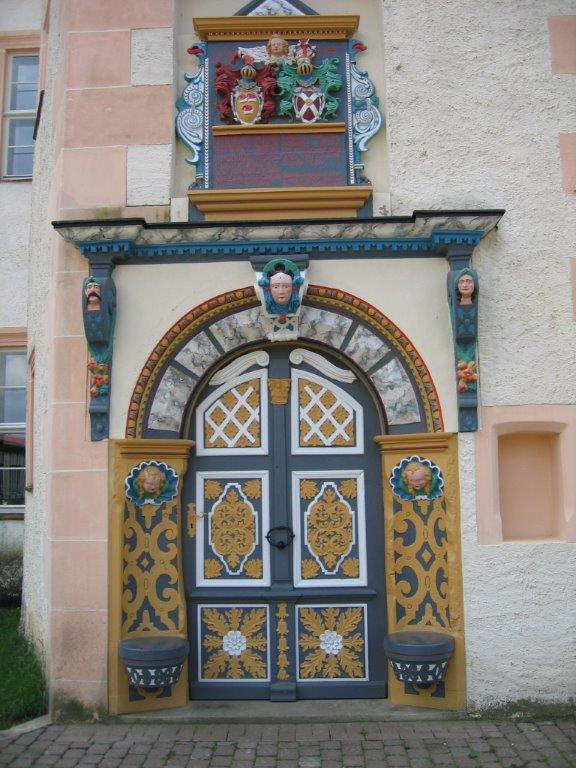 Portal aus Sandstein mit reicher, mehrfarbig gefasster Renaissanceornamentik. |