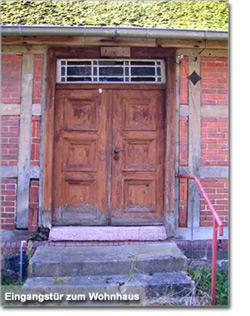 | Konstruktion | Wohnhaus ist ein traufständiger, eingeschossiger, neunachsiger Fachwerkbau auf einem Feldsteinsockel; das Satteldach trägt straßenseitig eine Schieferdeckung sowie hofseitig eine Biberschwanzdeckung; zu den Wirtschaftsgebäuden gehören: ein Backhaus am rechten Wohnhausgiebel, ein Stall der sich an das Backhaus anschließt und eine Fachwerkscheune aus Eichenholz, dessen Gefache ursprünglich vollständig mit Lehmstaken geschlossen waren. |